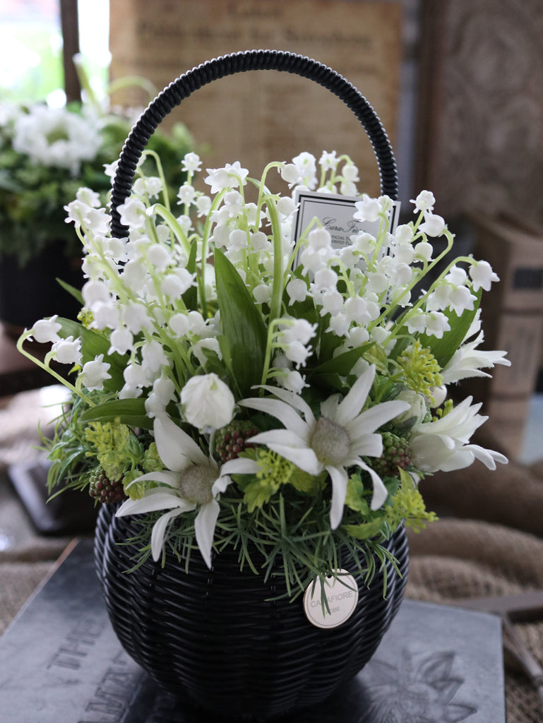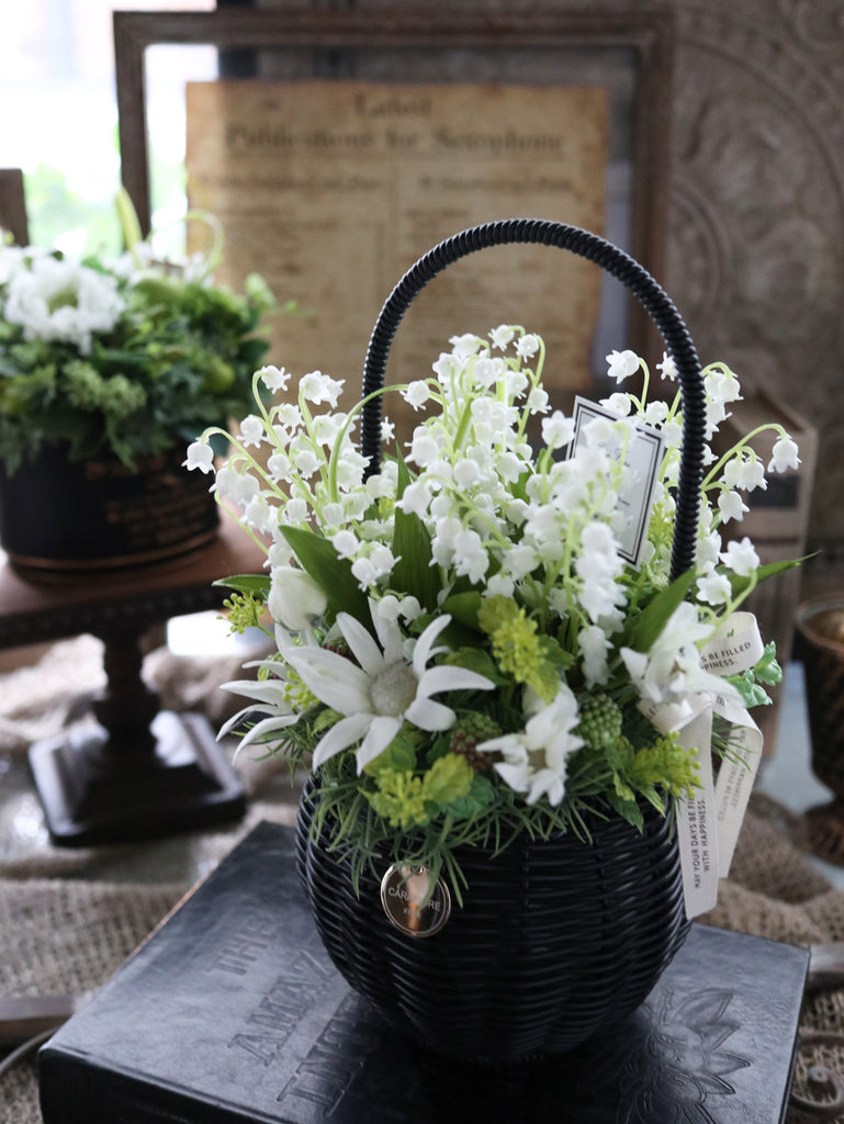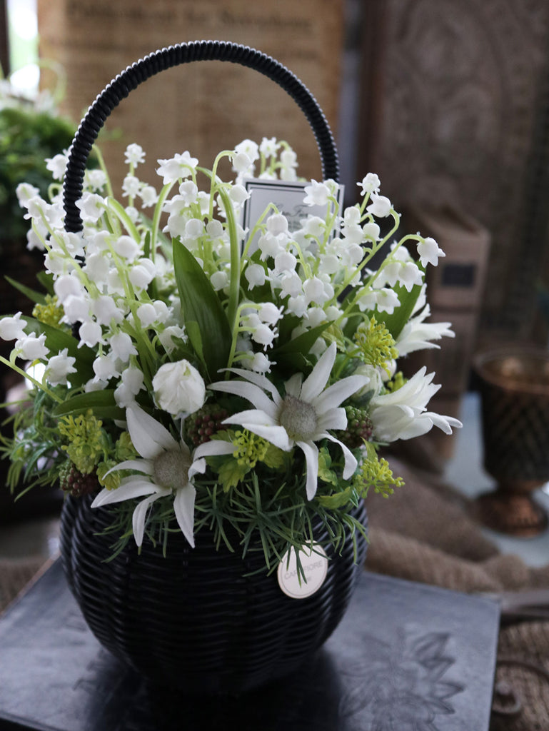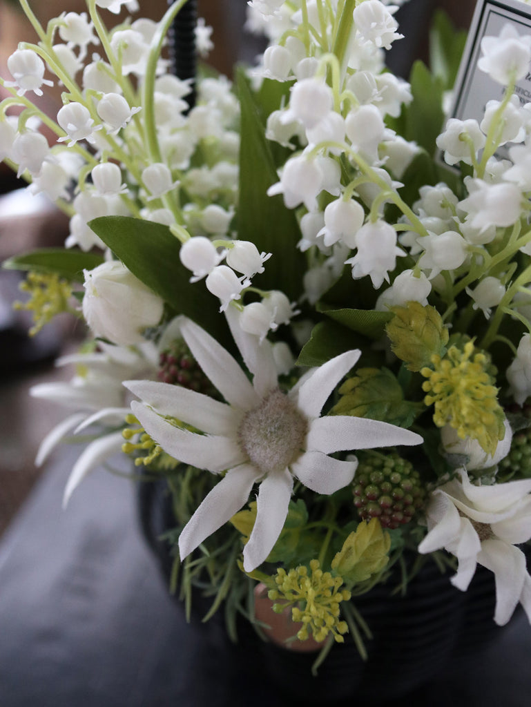 人気のスズランをメイン花材にフランネルフラワーとグリーンでまとめたフラワーアレンジメントです